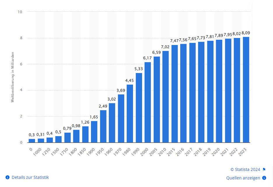Also wenn man bedenkt, für ein Stück Rindfleisch (je nach Kalb oder ausgewachsen) werden bis zu 20.000 Liter Wasser benötigt !!! Da wird einem ja mal ganz anders, aber das Tier wurde ja bis hin zur Verarbeitung als Nahrung mit Wasser und Futter versorgt, hierzu wird wiederum Wasser benötigt, um das Futter herzustellen / zu züchten etc. und das Tier selber benötigt ja, genau wie wir Menschen, täglich sein Trinkwasser (über die Qualität des Wassers an die Tiere erlauben wir uns mal keine Spekulationen). Jeder Fertigungsprozess kostet also direkt oder indirekt Wasser und raten Sie mal was immer mehr benötigt wird bei nahezu 7,5 Milliarden Menschen auf der Welt (Tendenz steigend), Trinkwasser. Die Bevölkerung wächst unaufhörlich weiter, prozentual natürlich auch der Wasserbedarf und der Bedarf bei der Produktion um die vielen Menschen alle zu ernähren. Im krassen Gegenspiel steigert sich so natürlich auch immer mehr und mehr die Belastung aller Gewässer und verknappt die wertvollste Ressource der Welt immer mehr.