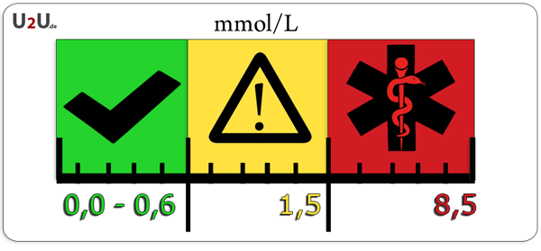 Ein gesunder Erwachsener hat normalerweise Keton-Blutwerte unter 0,6 mmol/l also im grünen Bereich. Ein erwachsener Diabetiker liegt hier so zwischen 0,6 und 1,0 mml/L was schon eine dezente Ketoazidose anzeigt. Wer sich nun unsicher ist was zu tun ist, lieber mal den Arzt oder Diabetologen befragen. Werte von 0,6 bis 1,5 mmol/L wird eine erfahrene Person nicht umwerfen wenn Anweisungen vom Arzt bekannt sind. Werte über 1,5 mmol/L erfordern schon medizinische Hilfe, ab zum Arzt. Werte über 3,0 mmol/L zeigen einen medizinischen Notfall an und hier sofort handeln. Bitte beachten, wir reden hier von Werten im Blut !