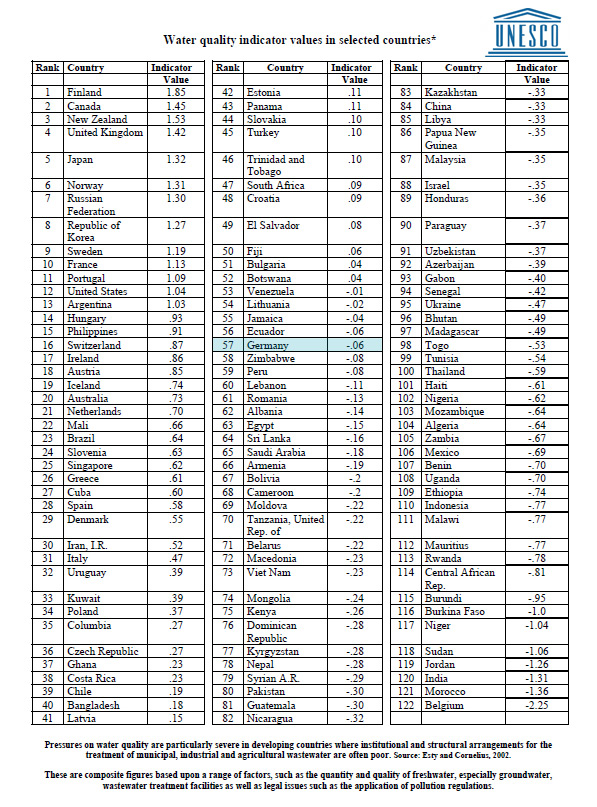 Bereits 2002/2003 wurde im Auftrag der UNESCO der „UNESCO Trinkwasser-Report“ erstellt, (siehe Bild rechts) und Deutschland belegt gerade mal das Mittelfeld mit Rang 57, selbst Mali hat besseres Wasser als Deutschland, Belgien belegt Rang 122. Nun sind etliche Jahre seit diesem Report vergangen, glauben Sie, die Belastungen wären weniger geworden? (Auf Bild klicken zum Zoomen)