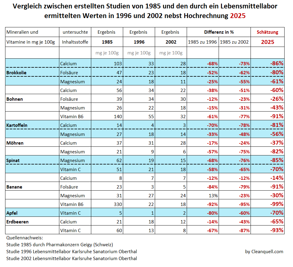 Unsere Böden sind ausgelaugt, falscher monotoner Anbau, zu lange Lagerung, zu frühe Ernte (z.B. Bananen etc. werden schon geerntet, obwohl die noch lange nicht gereift sind), sehr weite Lieferwege, Kühlkettenunterbrechungen, schnelleres unnatürliches Wachstum, Luftverschmutzung, Überdüngung, Pestizide etc. lassen den Wert / Gehalt an echten Nährstoffen immer weiter sinken. Der Gehalt (auf Bild klicken zum Zoomen) in der Nahrung sinkt immer weiter und was 1950 in der Nachkriegszeit noch enthalten war ist laut mehreren Studien bei weitem nicht mehr enthalten. Quasi essen wir keine z.B. Tomate mehr, sondern eine grössere rote Hülle, voller Wasser ohne hohen Nährwert und nur nach einer Tomate riecht und auch so aussieht.